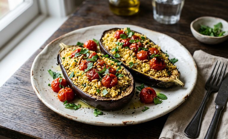 Las berenjenas rellenas de couscous y tomates confitados son una opción deliciosa y nutritiva para quienes buscan una receta rápida, saludable y con un toque mediterráneo. Esta preparación combina la suavidad y sabor de la berenjena asada con la textura ligera del couscous y el dulzor intenso de los tomates confitados, creando un plato lleno de contrastes y aromas. En este artículo, te guiaremos paso a paso para que puedas preparar este plato en casa de forma sencilla y con resultados sorprendentes.
