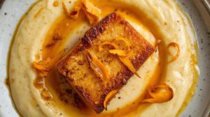 Filete de tempeh en koji con puré cremoso y cúrcuma fresca.
