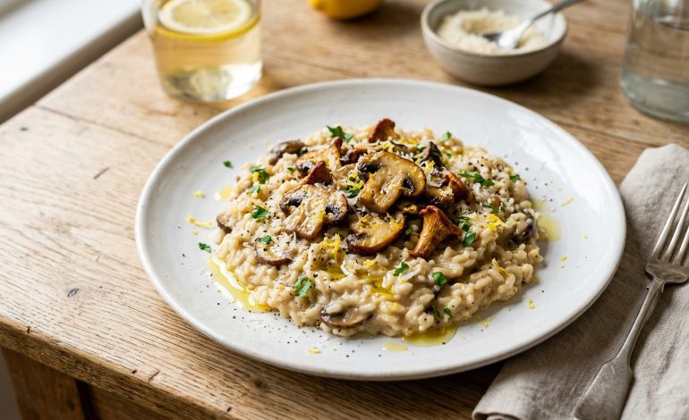 La frescura de los ingredientes es fundamental para un risotto sabroso y con buena textura. Los champiñones deben estar firmes, sin manchas ni humedad excesiva, ya que esto garantiza un sabor intenso y una cocción uniforme. El limón debe ser jugoso y con una piel que no esté gruesa ni amarga, pues su ralladura aportará un aroma fresco sin amargor. Por último, el arroz arborio o carnaroli son variedades que liberan almidón durante la cocción, creando esa textura cremosa característica del risotto.